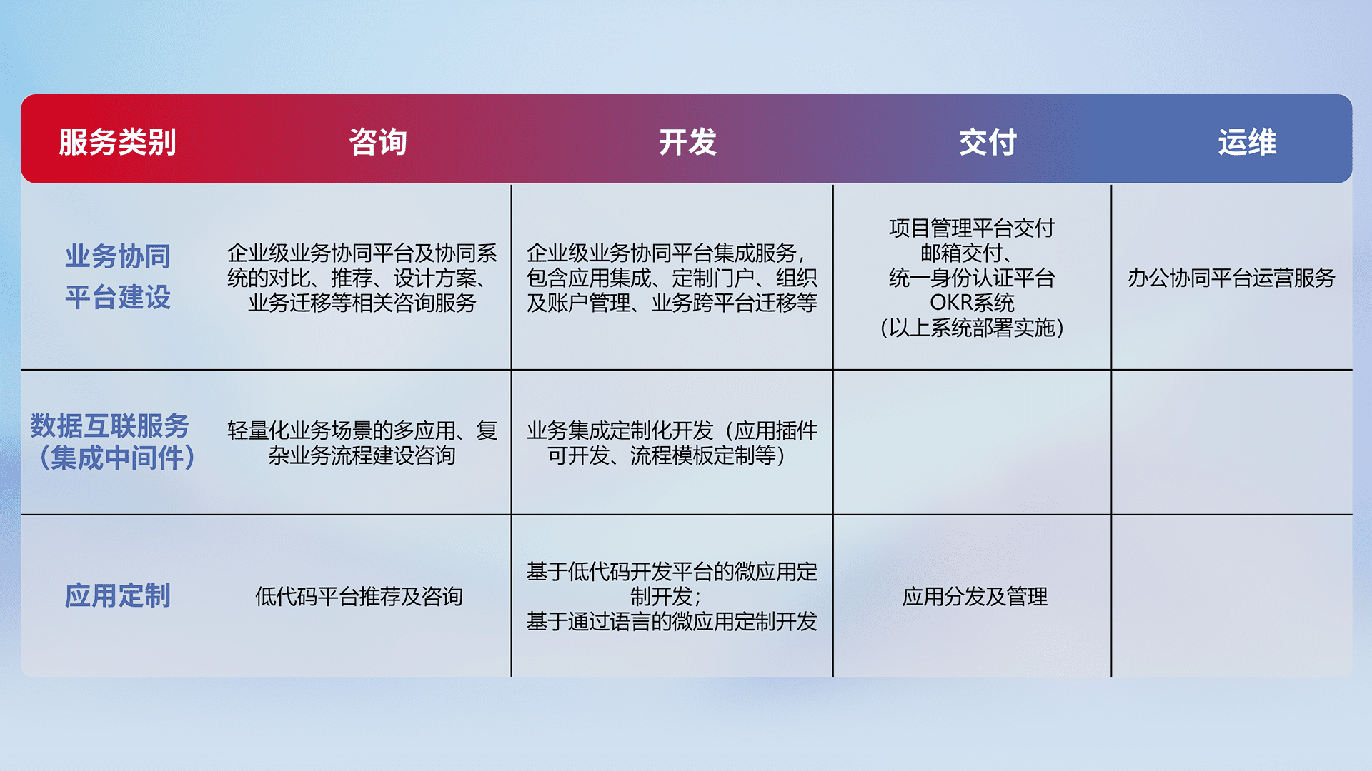 针对钉钉、、、、企微、、、IDaas等平台级产品提供产品的规划、、方案、、、、交付、、、定制化开发等服务,,实现如统一协同办公、、、智能客户服务、、混合会议管理、、智能数据查询、、、等业务场景,,,,实现数字化转型。。。。